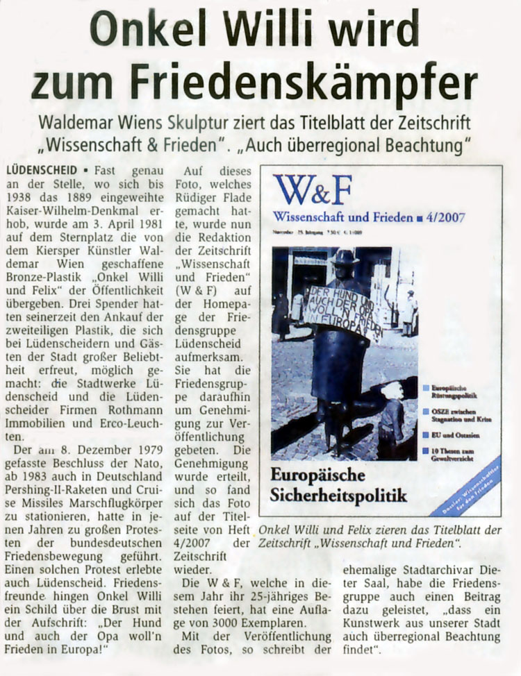 Auf dieses Foto, welches Rüdiger Flade geschossen hatte, wurde die Redaktion der Zeitschrift "Wissenschaft und Frieden" auf der Homepage der Friedensgruppe Lüdenscheid aufmerksam und bat die Friedensgruppe Lüdenscheid um Genehmigung zur Veröffentlichung. Die Genehmigung wurde erteilt und so fand sich das Foto auf der Titelseite von Heft 4/2007 der Zeitschrift "Wissenschaft und Frieden" (W&F) wieder.