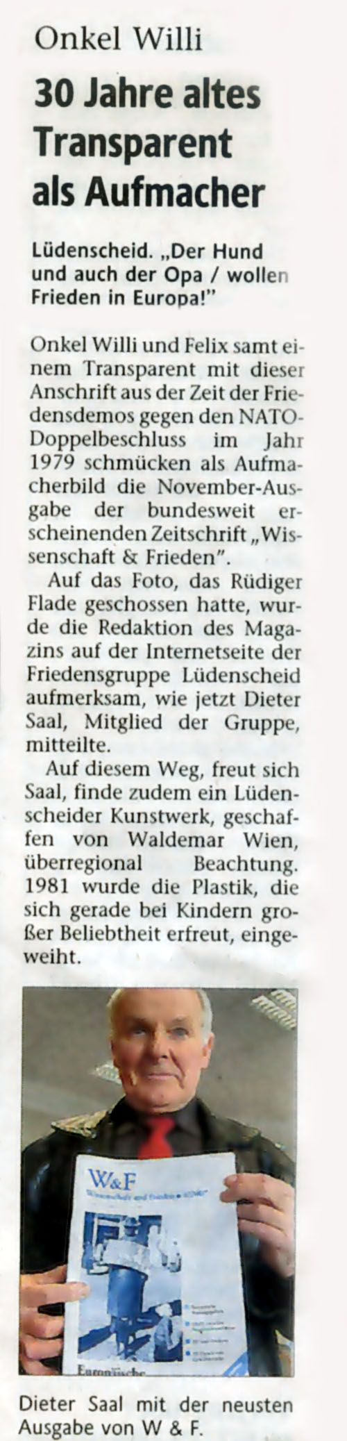 Der am 8. Dezember 1979 gefasste Beschluss der Nato, ab 1983 auch in Deutschland Pershing-II-Raketen und Cruise Missiles Marschflugkörper zu stationieren, führte zu großen Protesten der bundesdeutschen Friedensbewegung, an der sich auch LüdencheiderInnen beteiligten. Einen solchen Protest erlebte auch Lüdenscheid. Friedensfreunde hingen Onkel Willi ein Schild über die Brust mit der Aufschrift: Der Hund und auch der Opa woll'n Frieden in Europa!